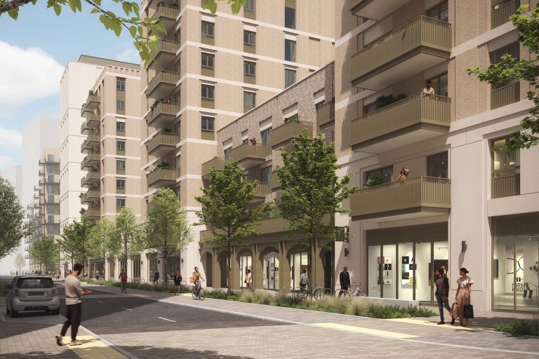 The developed proposals will deliver 867 new homes, of which 35% are affordable by habitable room (including 30% provided as London Affordable Rent and 70% provided as Shared Ownership), alongside a generous shared amenity offering for all residents’, including three podium gardens with dedicated playspace for different ages, accessible roof terraces, a gym and leisure suite, residents’ lounge, co-working spaces, cinema room and games room.