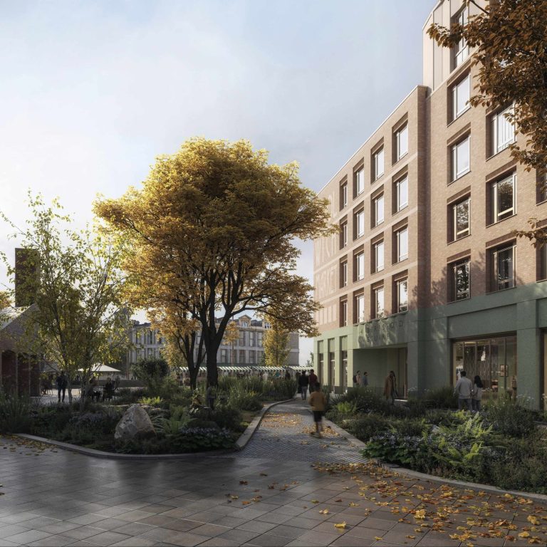 The building’s massing has been articulated to reduce its impact on key views and reinforce the spatial enclosure of the square. The architectural language draws on the material palette of the conservation area, with detailing intended to reference the character of the historic market buildings in a contemporary way.